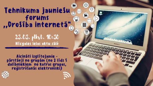 Š.g. 23.03. Nīcgales ielas aktu zālē plkst. 10:30 norisināsies tehnikuma jauniešu forums ,,Drošība internetā”.