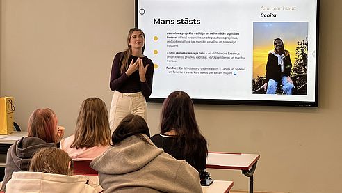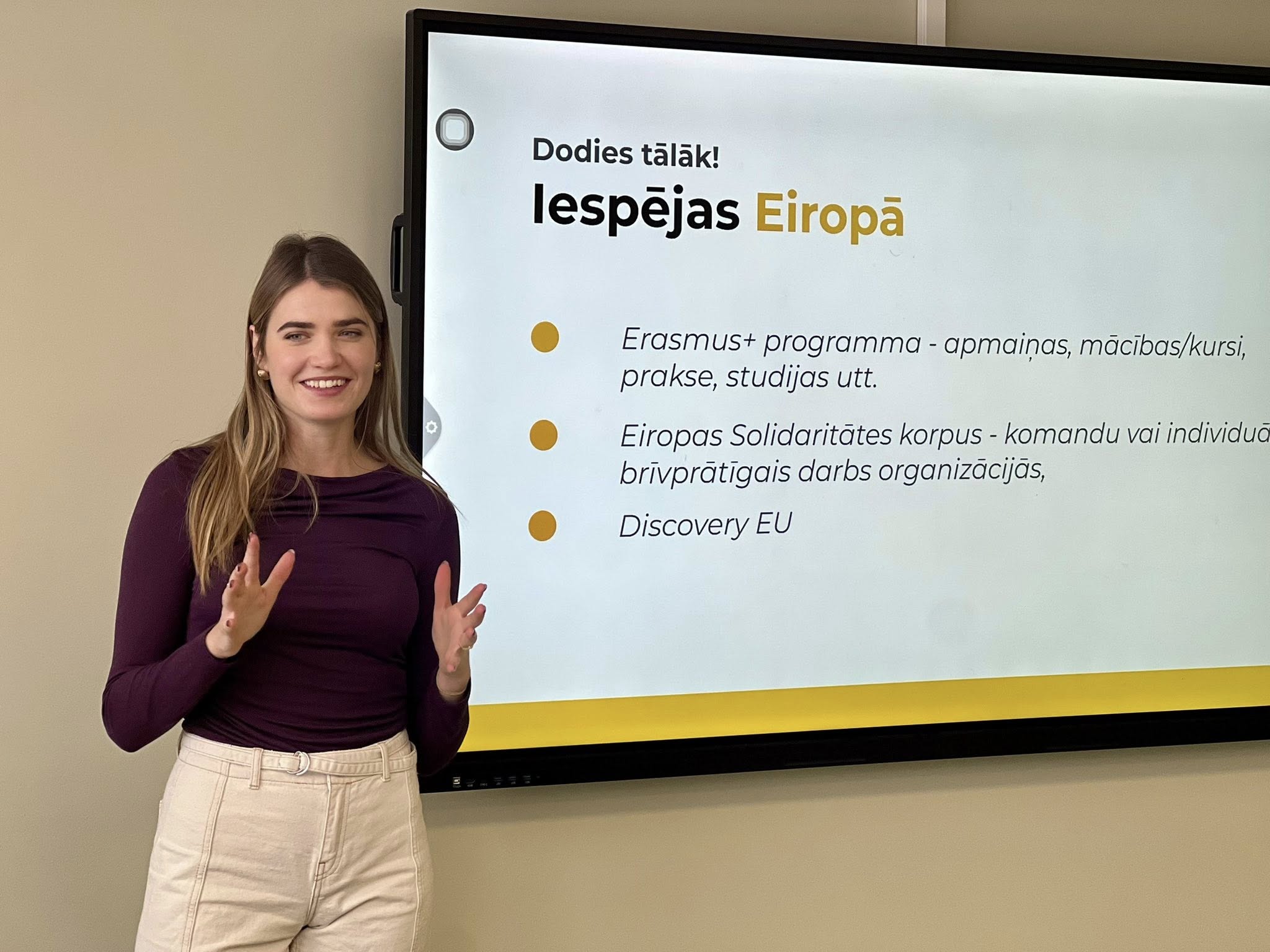 Tikšanās laikā Benita iepazīstināja jauniešus ar plašajām iespējām Eiropā – no dalības starptautiskos projektos līdz personīgās izaugsmes un karjeras iespējām. Viņa dalījās arī savā pieredzē, stāstot par laiku tehnikumā un dalību Erasmus+ mobilitātēs, uzsverot, cik nozīmīgas šīs pieredzes ir gan profesionālajai, gan personīgajai attīstībai.