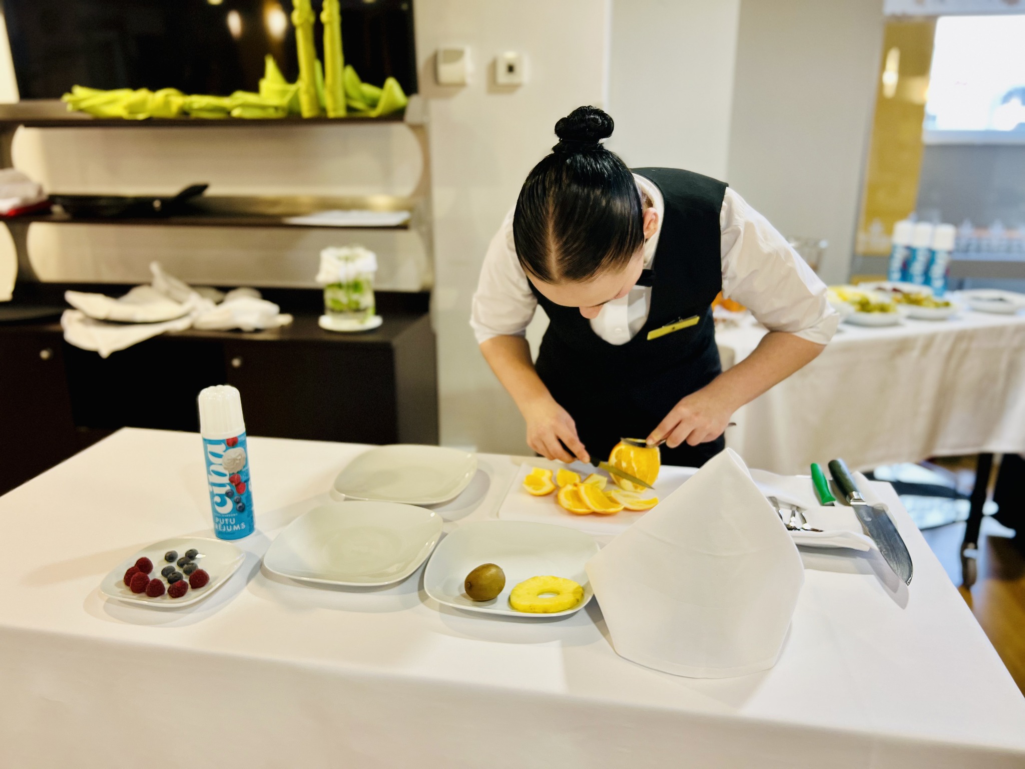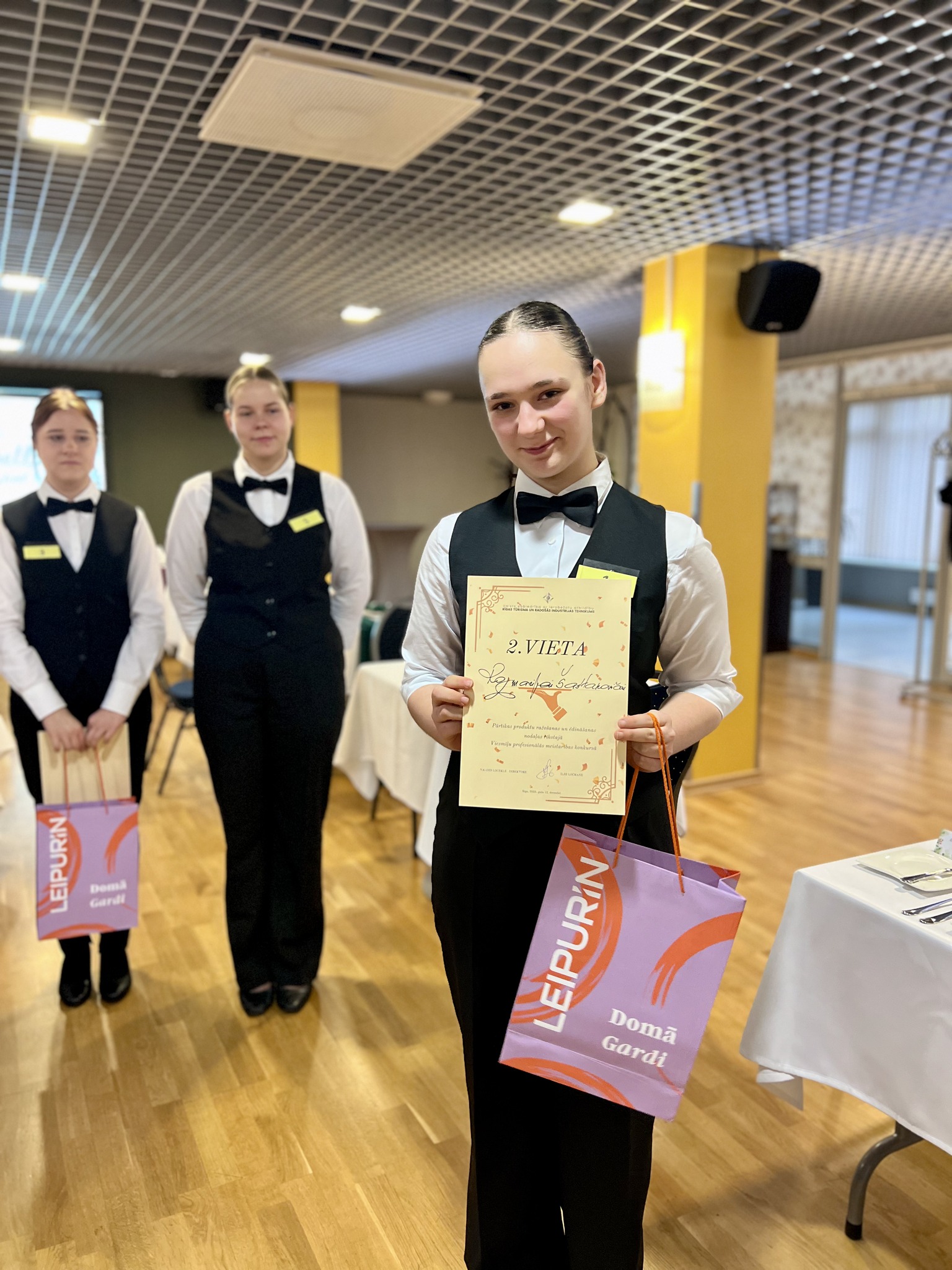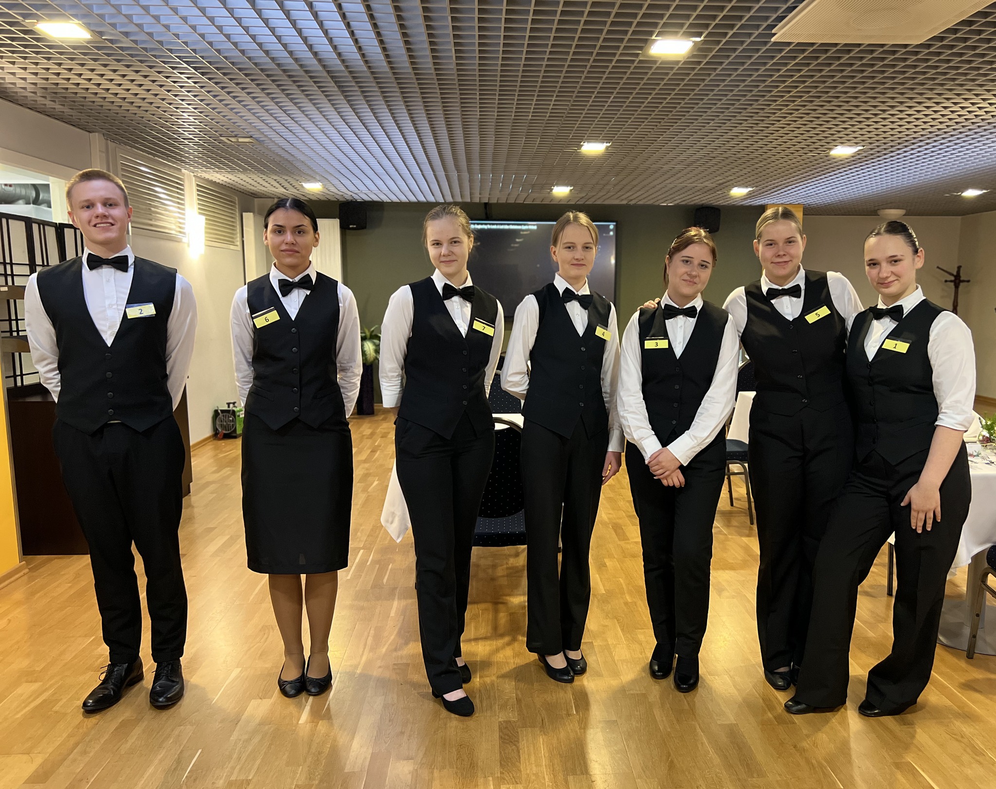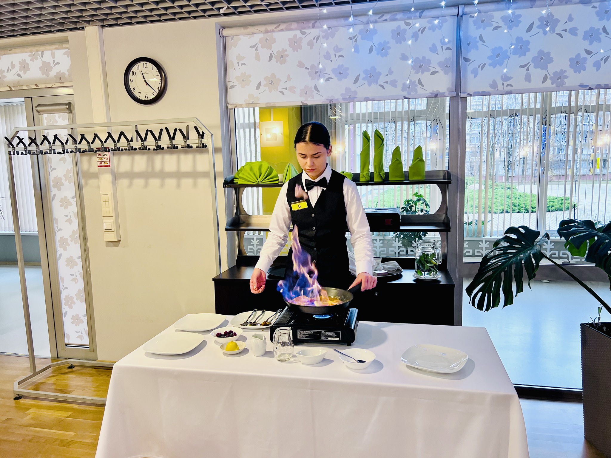 Jaunie topošajiem viesmīļi pierādīja savu prasmi eleganti klāt galdu, profesionāli apkalpot viesus, veikt flambēšanu un izveidot mākslinieciski skaistu augļu plati. Šī bija lieliska iespēja demonstrēt zināšanas, ātrumu, iznesību un radošumu – prasmes, kas viesmīlības nozarē ir neatsveramas.