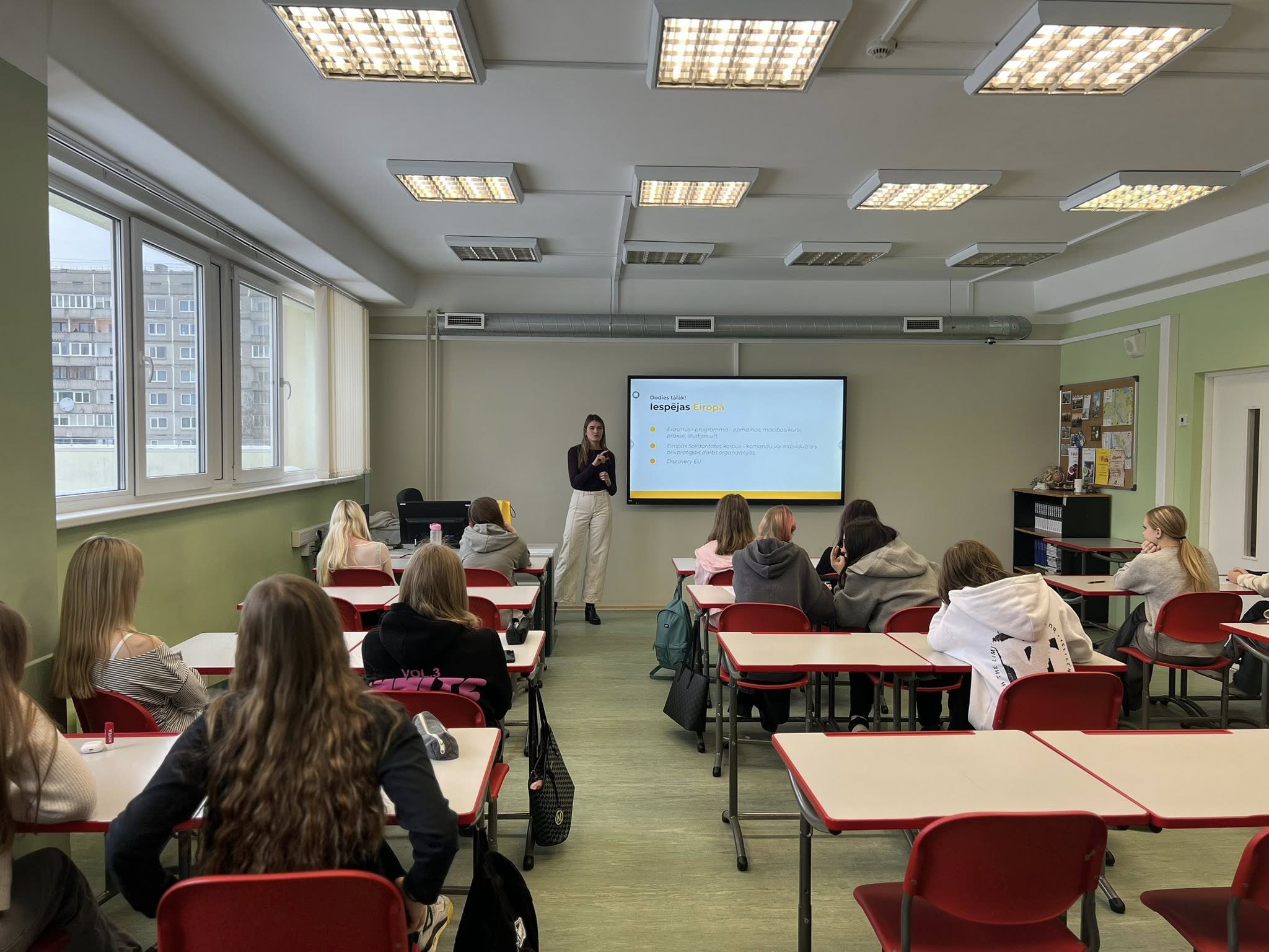 Tikšanās laikā Benita iepazīstināja jauniešus ar plašajām iespējām Eiropā – no dalības starptautiskos projektos līdz personīgās izaugsmes un karjeras iespējām. Viņa dalījās arī savā pieredzē, stāstot par laiku tehnikumā un dalību Erasmus+ mobilitātēs, uzsverot, cik nozīmīgas šīs pieredzes ir gan profesionālajai, gan personīgajai attīstībai.