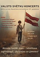 VALSTS SVĒTKU KONCERTS veltīts Latvijas Republikas proklamēšanas 107. gadadienai Piedalās: – Jauktais koris “Pustonis” – Vokālais ansamblis “Rondo” – Teātra studija “Etīde” ...
